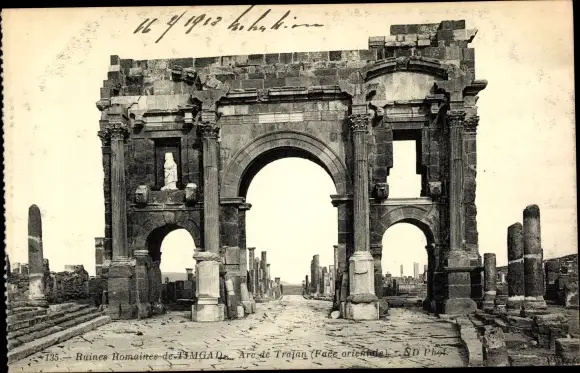 Ak Timgad Algerien, Ruines Romaines, Arc de Trajan, Triumphbogen, Trajansbogen