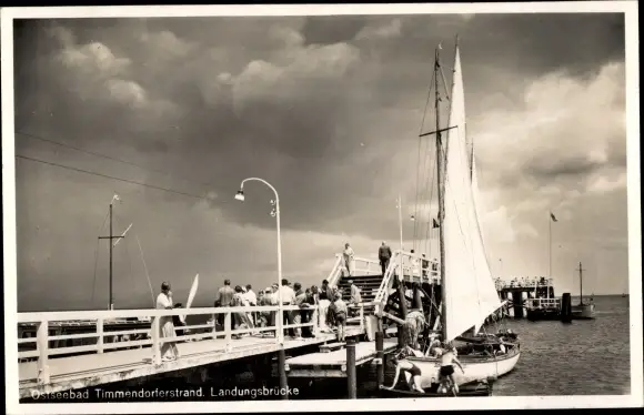 Ak Timmendorfer Strand, Landungsbrücke, Segelboot