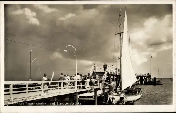 Ak Timmendorfer Strand, Landungsbrücke, Segelboot