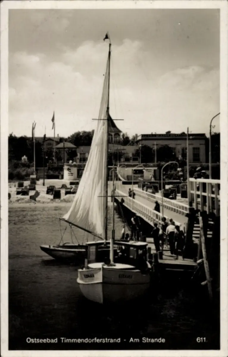 Ak Timmendorfer Strand in Ostholstein, Am Strande, Seebrücke, Segelboot Germania