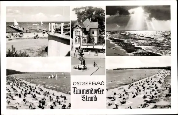 Ak Timmendorfer Strand in Ostholstein, Landungsbrücke, Segelboote, Strand, Sonnenlicht durch Wolke