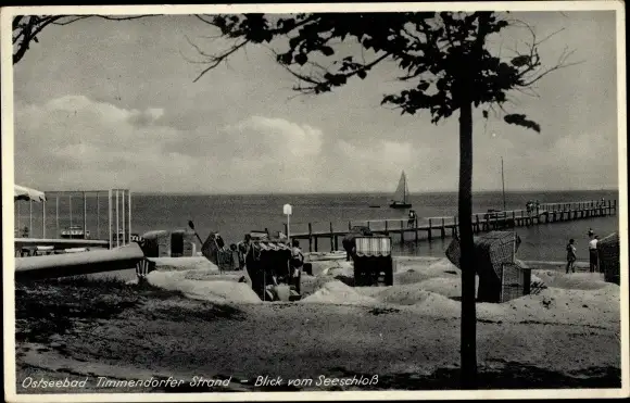 Ak Timmendorfer Strand in Ostholstein, Seeschloss, Landungsbrücke, Segelboot