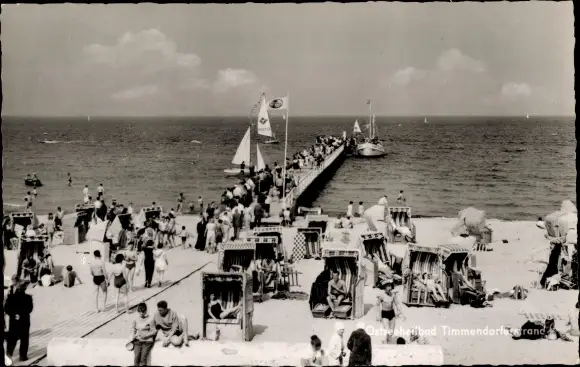 Ak Timmendorfer Strand in Ostholstein, Strandleben, Landungssteg, Segelboote, Strandkörbe
