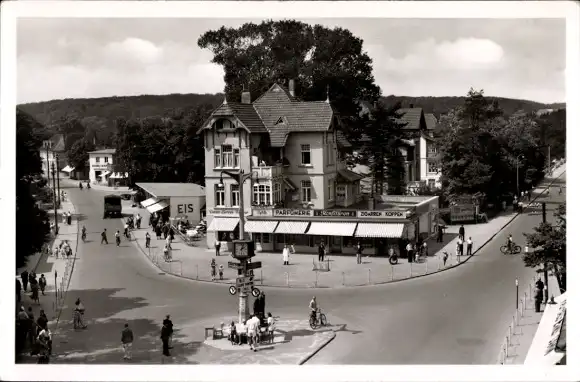 Ak Timmendorfer Strand in Ostholstein, Straßenpartie an der Normaluhr, Geschäfte