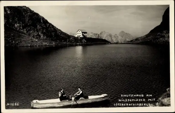 Ak Tirol, Schutzhaus am Wildseeloder mit Loferer Steinberge, Ruderpartie