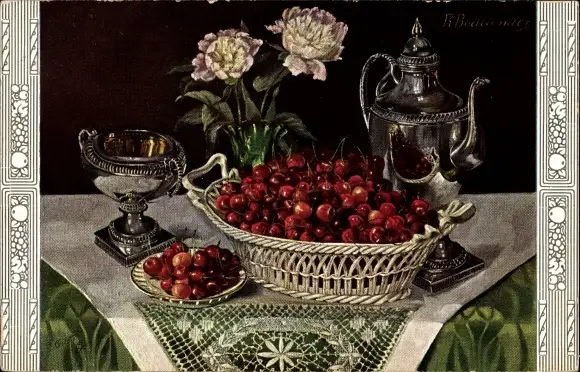 Ak Tisch, Blumen, Teekanne, Süßkirchen im Korb