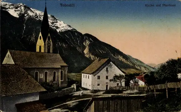 Ak Tobadill Tirol, Kirche und Pfarrhaus
