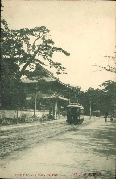 Ak Tokio Präf. Tokio Japan, Straßenbahn, Temple Zo-Jo-Ji