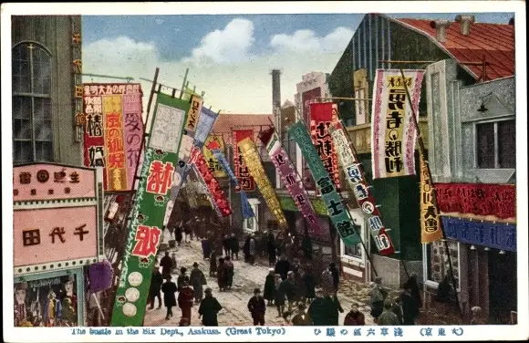 Ak Tokyo Tokio Japan, Stadtansicht, Passanten, Festschmuck, Fahnen