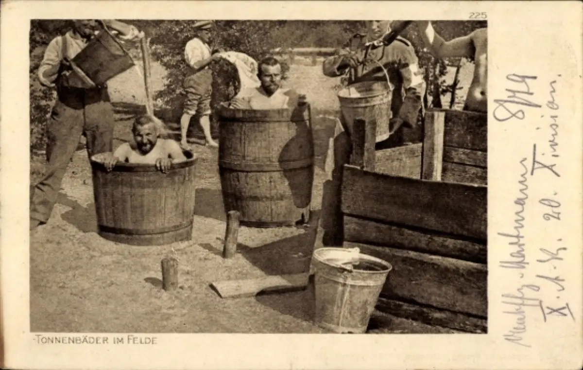 Ak Tonnenbäder im Felde, Soldaten, I WK