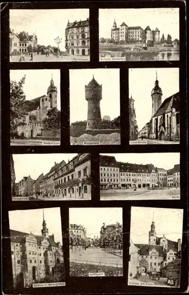 Ak Torgau an der Elbe, Wasserturm, Stadtkirche, Marktplatz, Schloss Hartenfels, Bahnhofstraße
