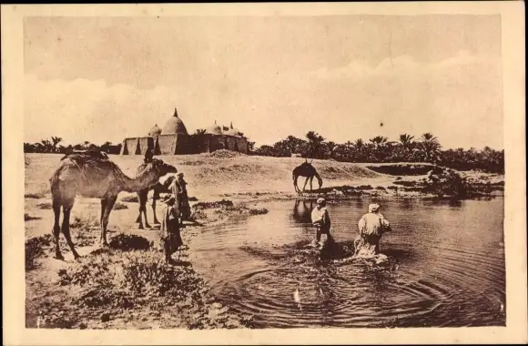 Ak Touggourt Algerien, Aux abords de la mosquee de l'oasis, Kamele