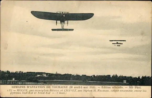 Ak Touraine Aviation Week 1910, Eindecker Molon, Bleriot, Doppeldecker Chavez, Farman