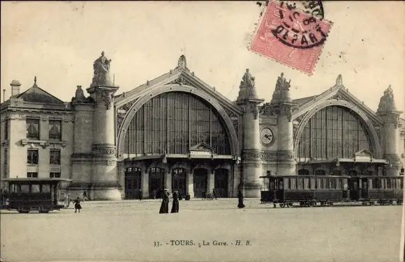 Ak Tours Indre et Loire, Bahnhof, Straßenseite, Straßenbahnen