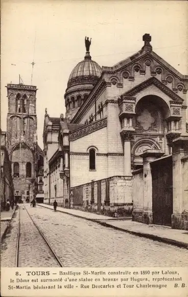 Ak Tours Indre et Loire, Basilique St. Martin, Rue Descartes, Tour Charlemagne