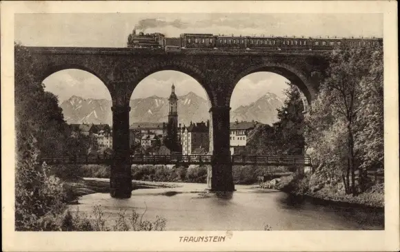 Ak Traunstein in Oberbayern, Brücke, Eisenbahn