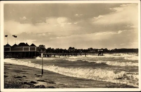 Ak Travemünde Lübeck, Strand, Wellengang, Flaggen