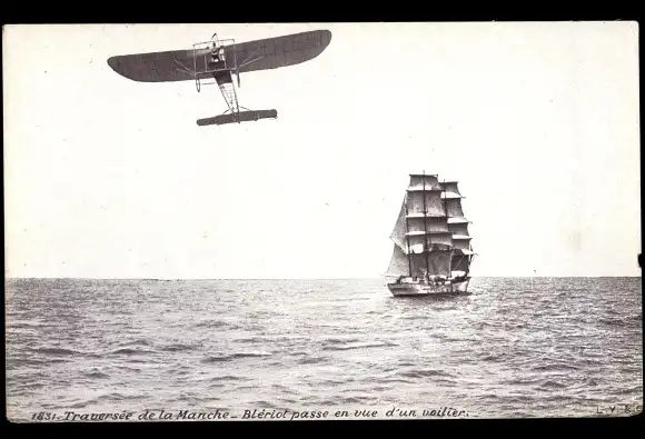 Ak Traversée de la Manche, Blériot passe en vue d'un voilier