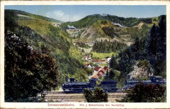 Ak Triberg im Schwarzwald, Schwarzwaldbahn, 3 Bahnlinien, Eisenbahn, Bachjörg