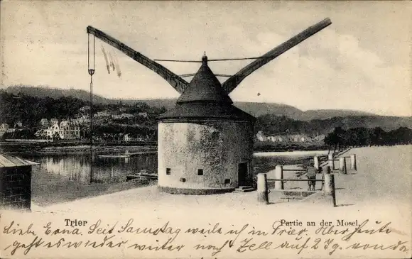 Ak Trier an der Mosel, Partie an der Mosel, Gebäude, Kran