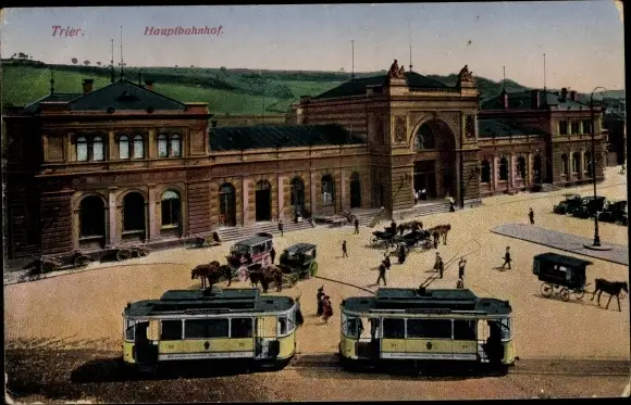 Ak Trier in Rheinland Pfalz, Hauptbahnhof, Straßenbahnen