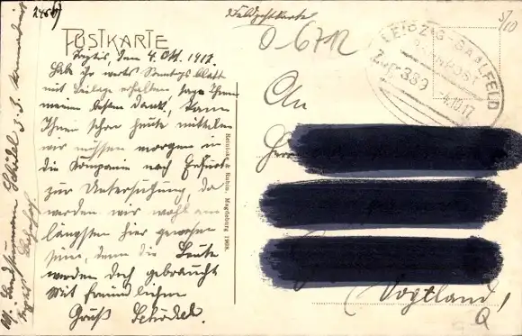 Zustand, siehe Scan, gelaufen, 1917- Bahnpost Leipzig-Saalfeld, Zug Nr. 389 - ca 14 cm X 9 cm