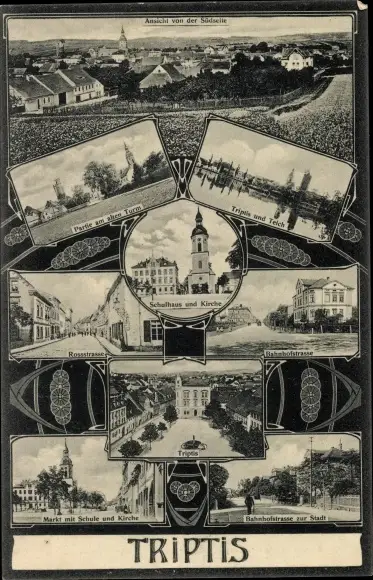 Ak Triptis in Thüringen, Gesamtansicht, Partie am alten Turm, Bahnhofstraße, Markt, Schule, Kirche