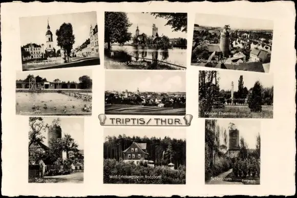 Ak Triptis in Thüringen, Kirche und Schule, Schlossturm, Sommerbad, Krieger-Ehrenmal, Erholungsheim