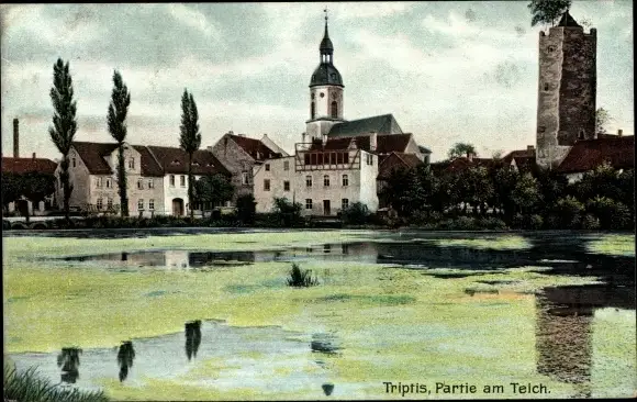 Ak Triptis in Thüringen, Partie am Teich, Turm, Kirche