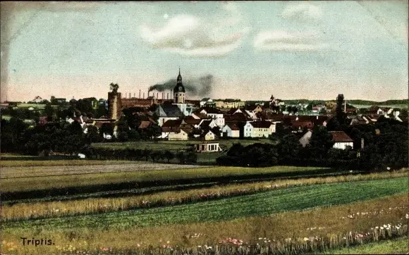 Ak Triptis in Thüringen, Stadtpanorama, Glockenturm, Felder, Gebäude