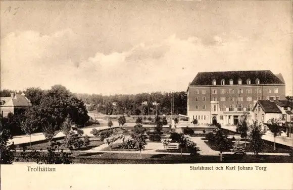 Ak Trollhättan Schweden, Stadshuset och Karl Johans Torg