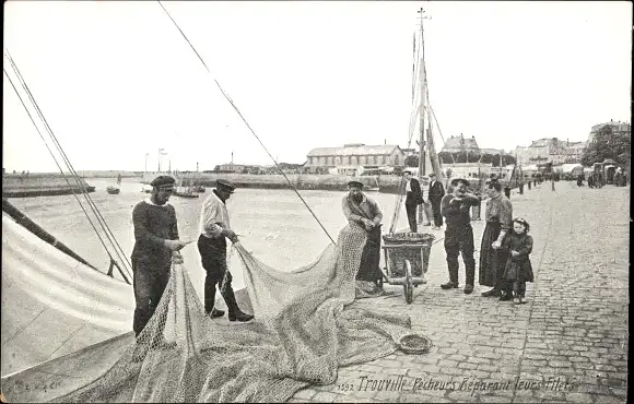 Ak Trouville Calvados, Pecheurs reparant leurs Filets