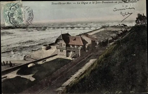 Ak Trouville Calvados, la digue et la Jetée-Promenade un jour de Tempête
