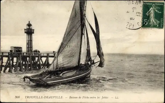 Ak Trouville Deauville Calvados, Fischerboot, Leuchtturm