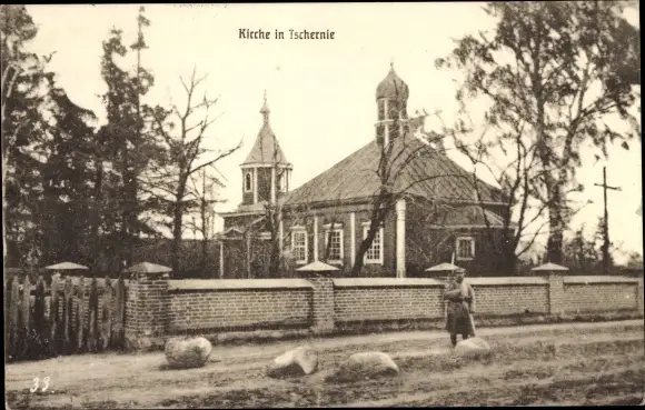 Ak Tscherni Weißrussland, Kirche, Straßenpartie, Passantin