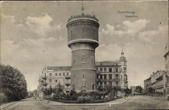 Ak Tschernjachowsk Insterburg Ostpreußen, Wasserturm, historisches Gebäude, Straßenansicht, Hi...