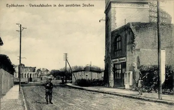 Ak Tschernyschewskoje Eydtkuhnen Ostpreußen, Verkaufsbuden in den zerstörten Straßen
