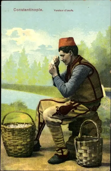 Ak Türkischer Eierverkäufer in Tracht, Portrait, Körbe, Uferpartie, Istanbul