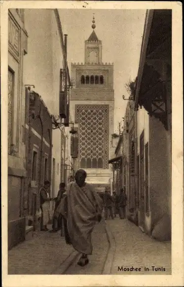 Ak Tunis Tunesien, Moschee in enge Gasse, historische Architektur