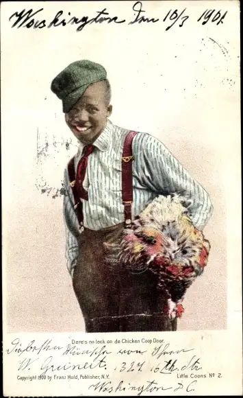 Ak USA, Dere's no lock on de Chicken Coop Door, Junge mit Huhn