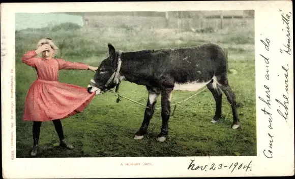 Ak USA, Esel beißt in das Kleid eines Mädchens
