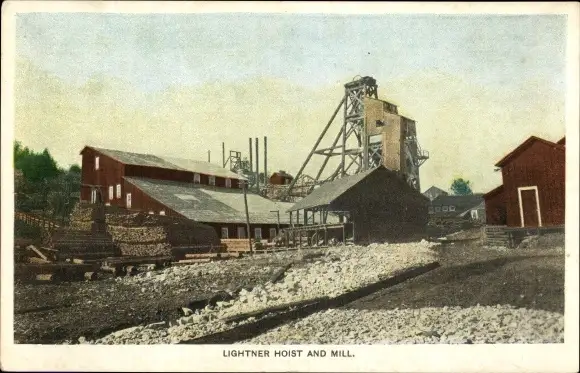 Ak USA, Lightner Hoist and Mill, Sägewerk, Holzbretter, Steine