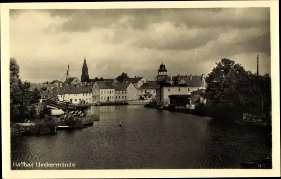 Ak Ueckermünde, Teilansicht, Boote, Ufer