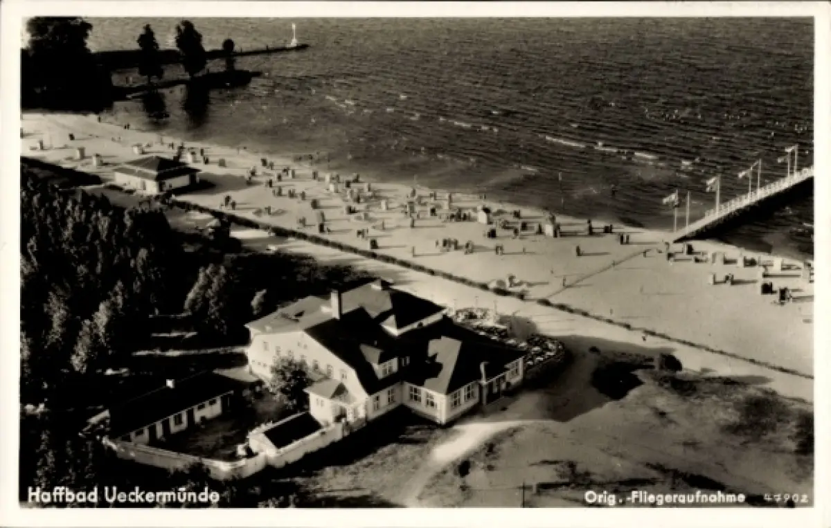Ak Ueckermünde in Vorpommern, Haffbad Strand, Wasser, Gebäude, Fliegeraufnahme