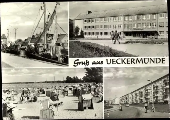 Ak Ueckermünde in Vorpommern, Strand, Hafen, Neubaugebiet, Oberschule