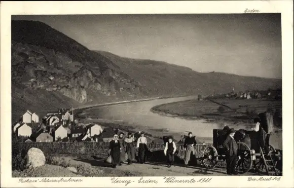 Ak Ürzig an der Mosel, Weinernte 1911, Arbeiter, Kiepen, Panorama vom Ort