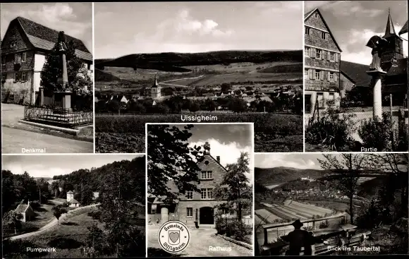 Ak Uissigheim Külsheim in Tauberfranken Baden, Teilansicht, Denkmal, Rathaus, Pumpwerk