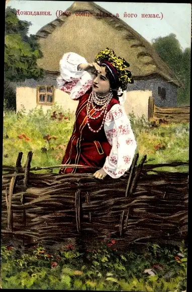 Ak Ukraine, Frau in Volkstracht, Wohnhaus, Zaun
