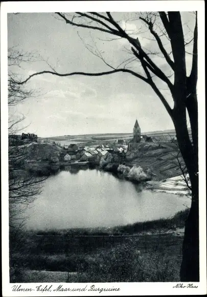 Ak Ulmen in der Eifel, Maar und Burgruine, Ortsansicht