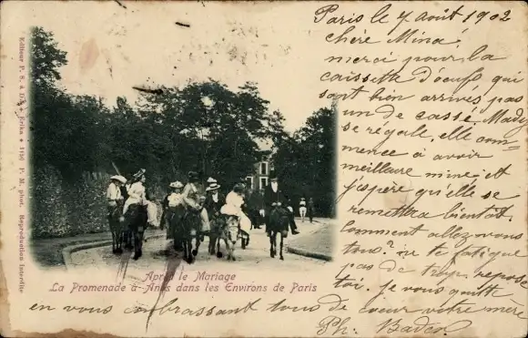 Ak Umgebung von Paris, Hochzeitspaar auf Eseln reitend